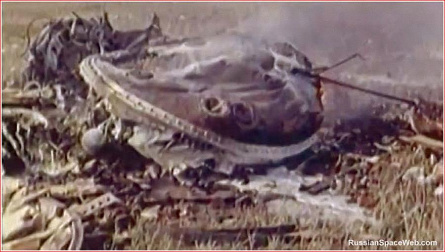 但是,这一次主降落伞没放出来。地面的监控人员都傻了,他们盯着监控信号,就这么眼睁睁的看着科马洛夫以 40 米/秒的时速撞向地面。科马洛夫马上放备份伞,可惜备份伞也没能打开。不但飞船摔下来砸扁了,而且点着了反推火箭燃料,最后炸得焦黑一片。科马洛夫的尸体完全烧焦了,而且残存下来的最大的碎片也只有 30 公分那么大,可见当时的场景有多惨。其他在地面测试过程之中死去的不算的话,科马洛夫是第一位在死在航天活动之中的宇航员。