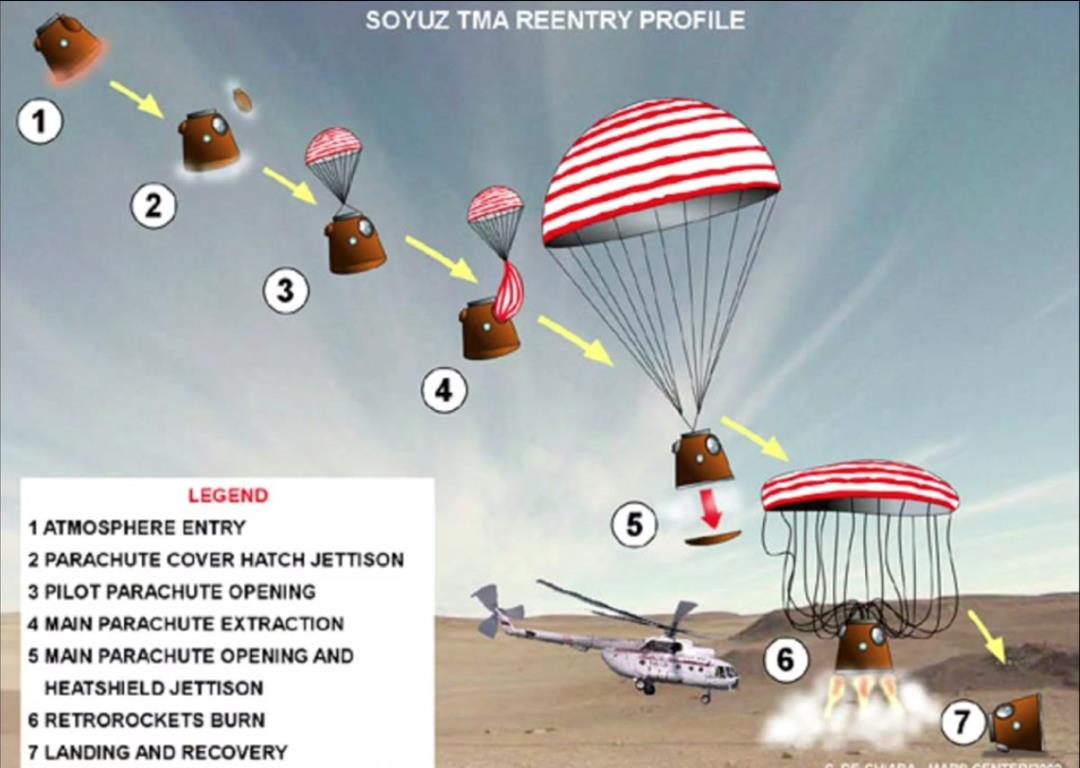 按理说,在大概 7000 米左右高度就应该打开降落伞。先是小引导伞弹出来,开始初步减速,然后拽出大引导伞,再经过一段减速,再拉出更大的减速伞。这时候,飞船的速度从 180 米/秒逐渐降低到 80 米/秒。就这么一级一级的缓冲,最后拉出主伞,主伞的面积高达 1000 平方米。这么大的伞,要是一下就拉出来,绳子根本承受不住。因此必须逐级放伞减速。