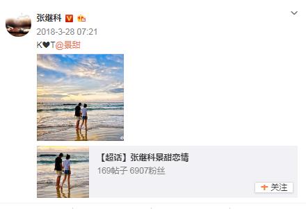 2018年3月28日,张继科在微博上晒出与景甜海边牵手的甜蜜照,表白景甜。