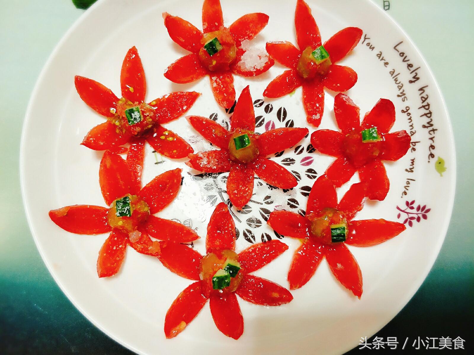 西红柿 故也称为“番茄”。 它既能生吃,炒菜,也可榨汁,做酱,所以也叫“蔬菜中的水果”。 众所周知,西红柿具有美容功效,是维生素含量高,但热量很低,是想节食的人很好的解饥食品选择,是所有爱美的想保持身材的美眉不二之选。 这道简单的西红柿经过一番巧梳妆打扮,绝对叫你眼前一亮越看越想吃哦(⊙o⊙)哦!