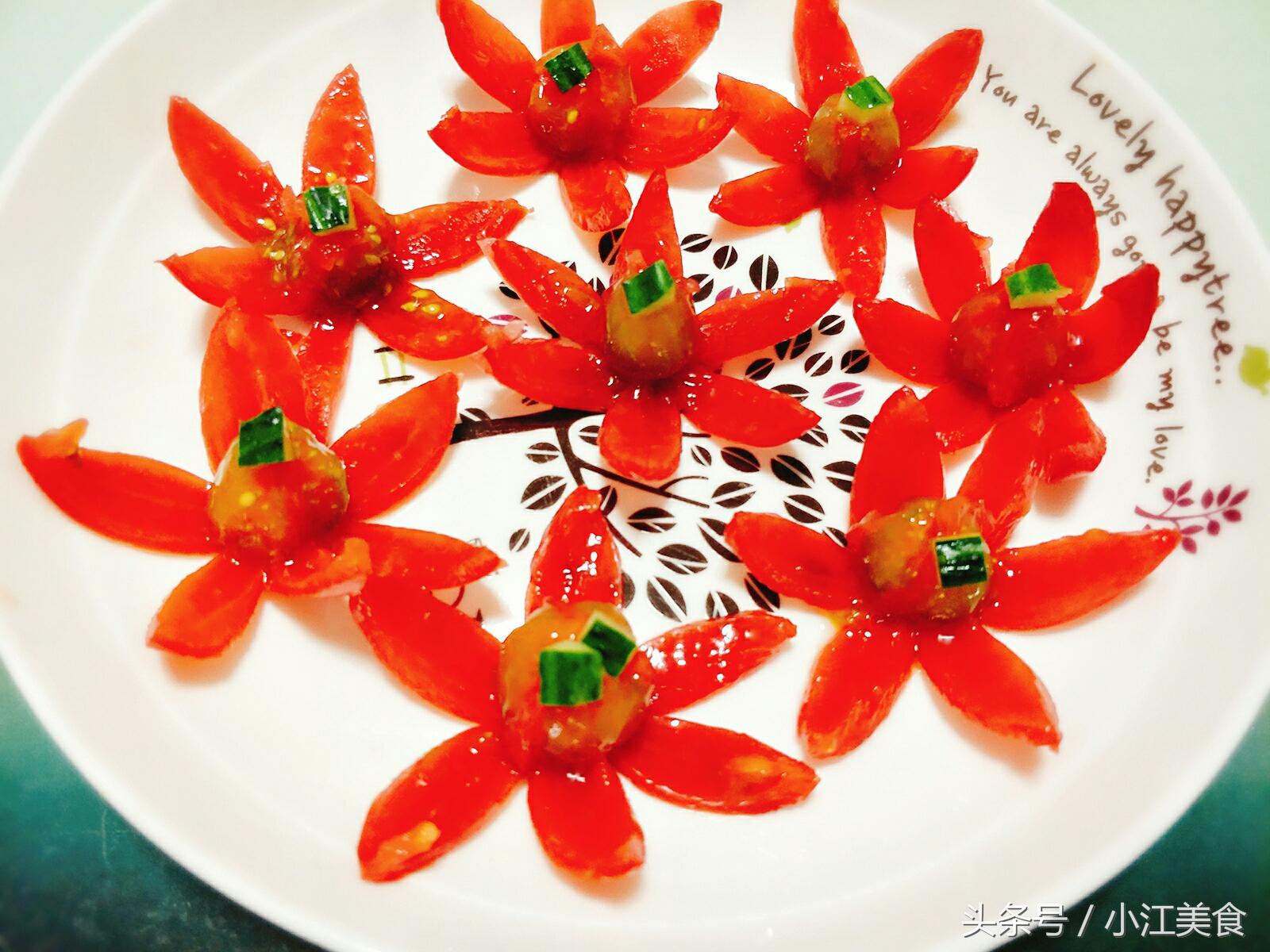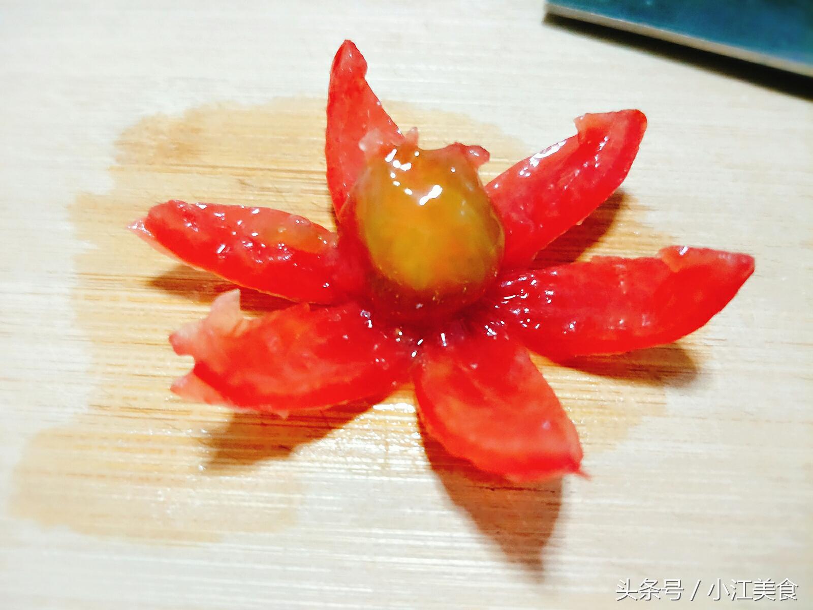 注意:小西红柿切的过程中瓣儿上容易粘连在一块儿,要小心切,不然中间的心就不完整了哦(⊙o⊙)哦!~