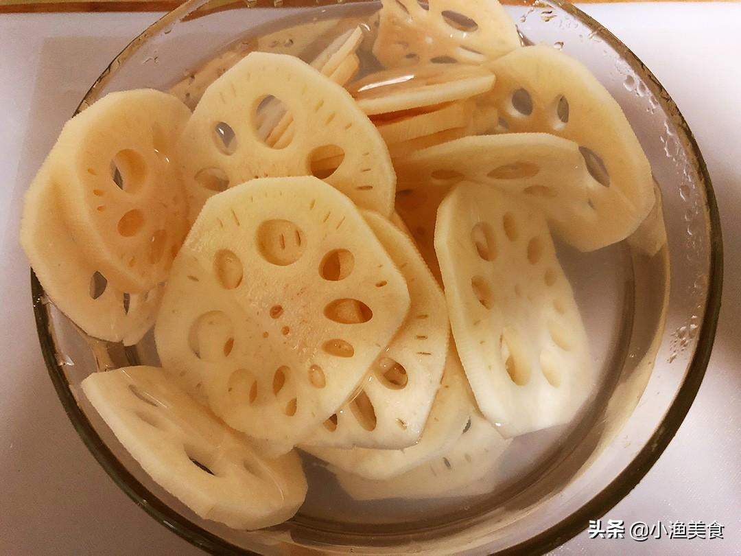 1、洗净的莲藕削掉外皮,切成薄厚适中的片放入碗中用水泡起来备用,这样可以防止莲藕氧化变黑。