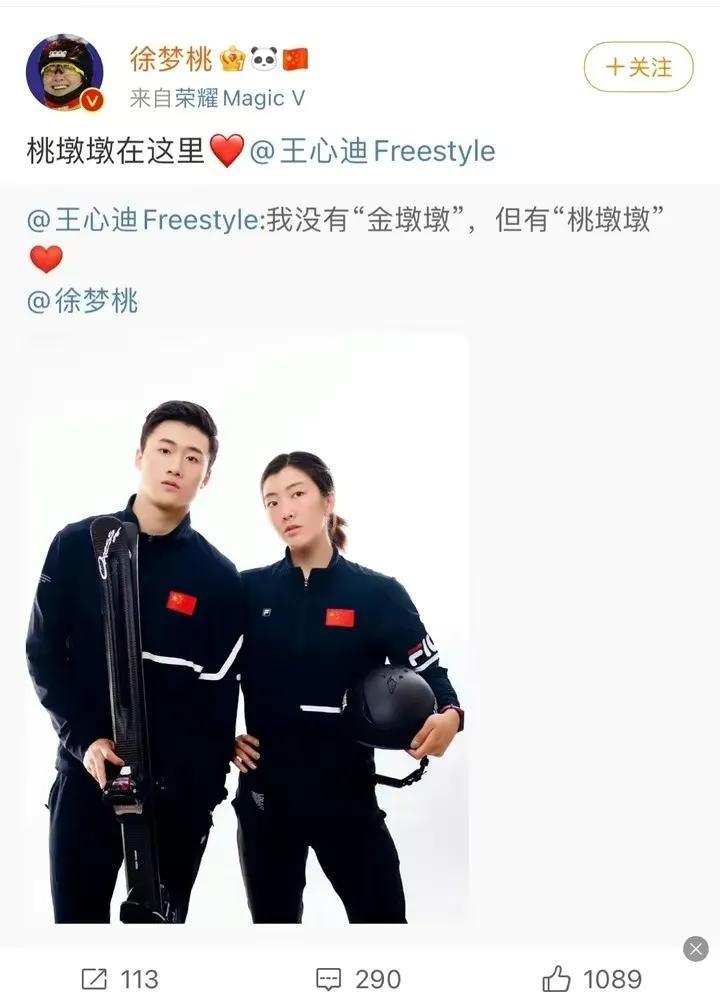徐梦桃在自己的微博上公布了恋情。微博显示,徐梦桃给王心迪留言:桃墩墩在这里。并附上王心迪的回复:我没有“金墩墩”,但有“桃墩墩”。两人的互动非常甜蜜。下面还晒出了两人的合影照片。