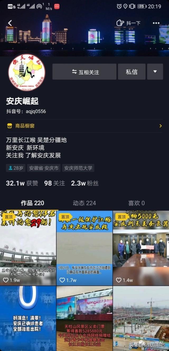 尤其在抖音平台,安庆崛起抖音号已拥有超过2W粉丝,不定期推送安庆城市航拍、城市规划、城市新闻等短视频资讯,还不快去关注,赶上新潮流!