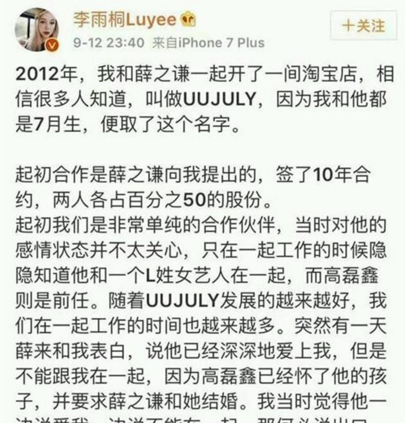 而一个叫“铁柱来了”的微博,他通过私信的形式说李雨桐养了薛之谦几年,而且说李雨桐单纯,并辱骂了高磊鑫……并且爆料,高磊鑫当时跟薛之谦分手,要了薛之谦1000万,薛之谦同意后,她又涨到了2000万……一时间也是吵得沸沸扬扬。
