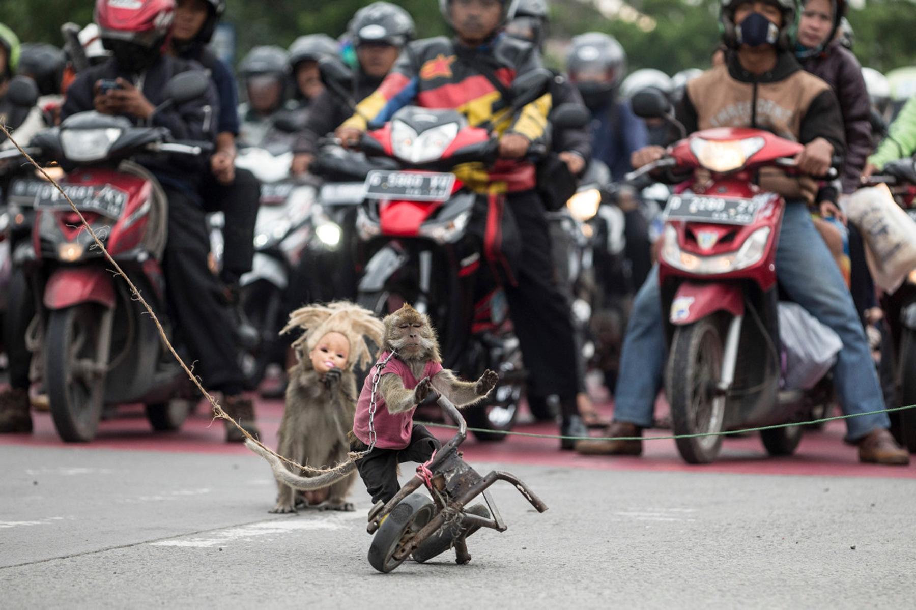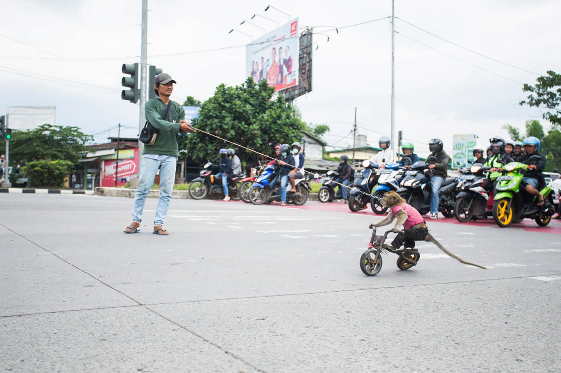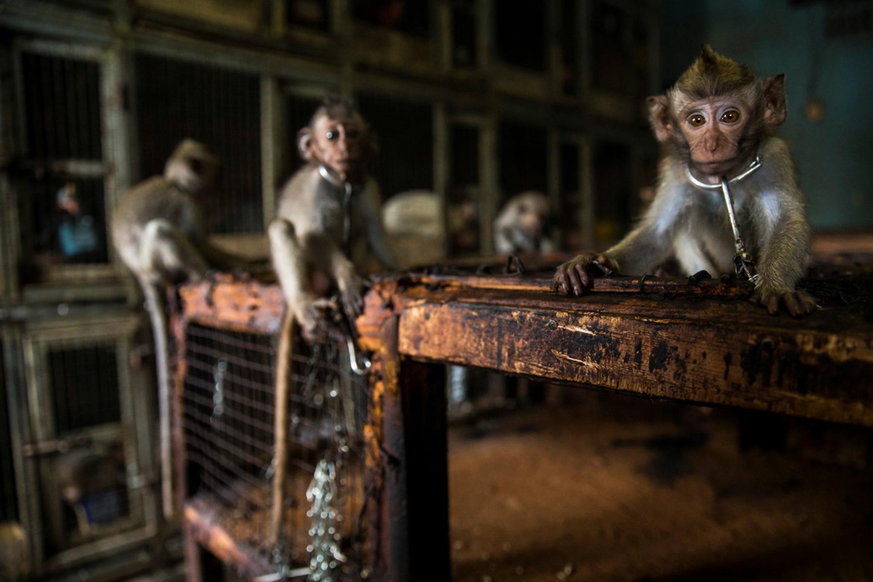 摄影师卢克·梅西在登巴萨和万隆市场上拍摄了长尾猕猴被拴在笼子里和小猴子被迫“营业”表演节目的照片。