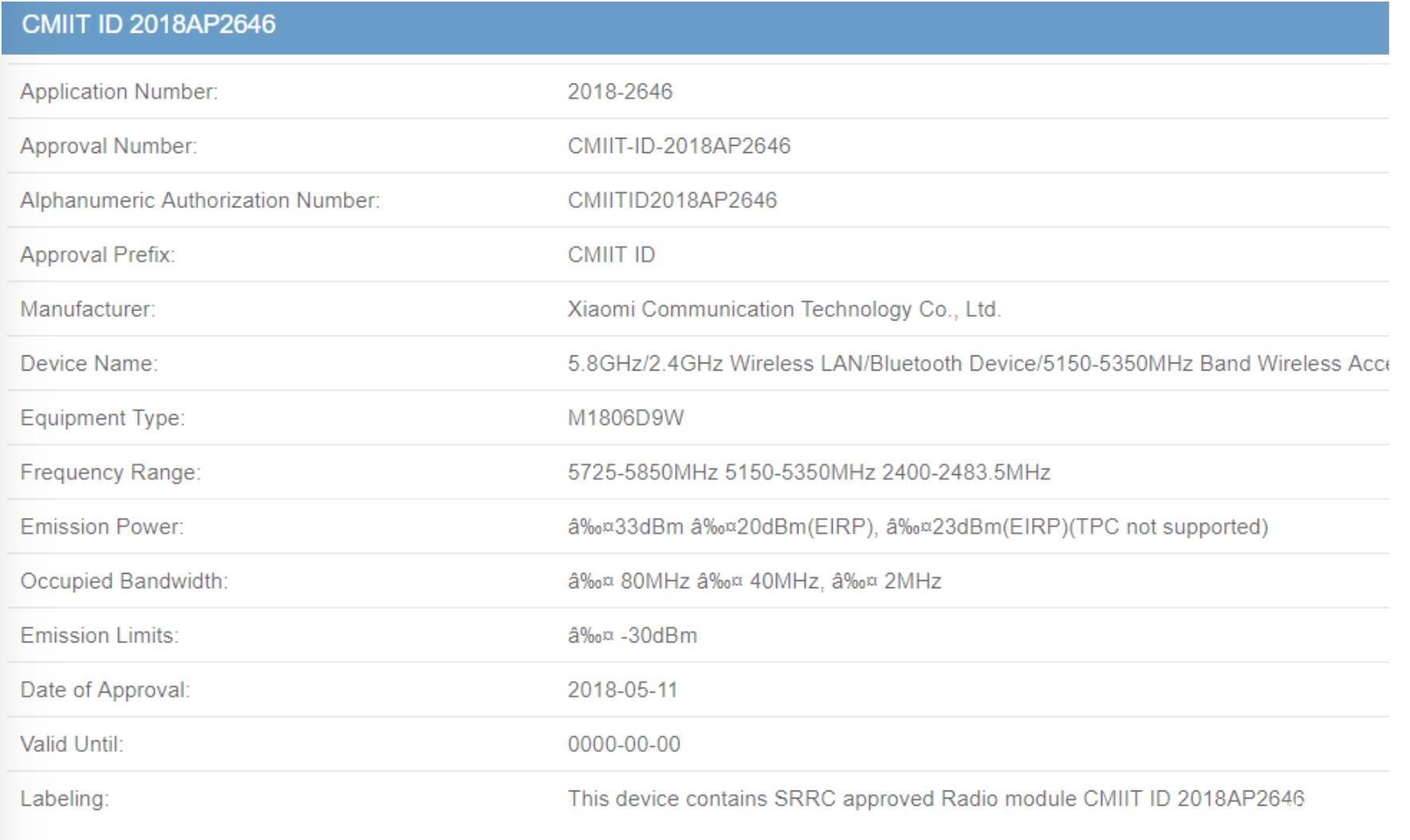 该设备的3C清单明确提到它是一款平板电脑,它支持5V / 2A充电。由于小米传闻将从2017年开始为小米Pad 3开发后继产品,因此M1806D9W设备很可能是即将推出的小米Pad 4.几个月前浮出水面的设备泄露的固件文件显示它配备6,000mAh电池,比小米pad3的6,600mAh电池略小。该器件还支持5.8GHz / 2.4GHz双频Wi-Fi。很可能就像小米pad3一样,小米Pad 4将只支持Wi-Fi模式。