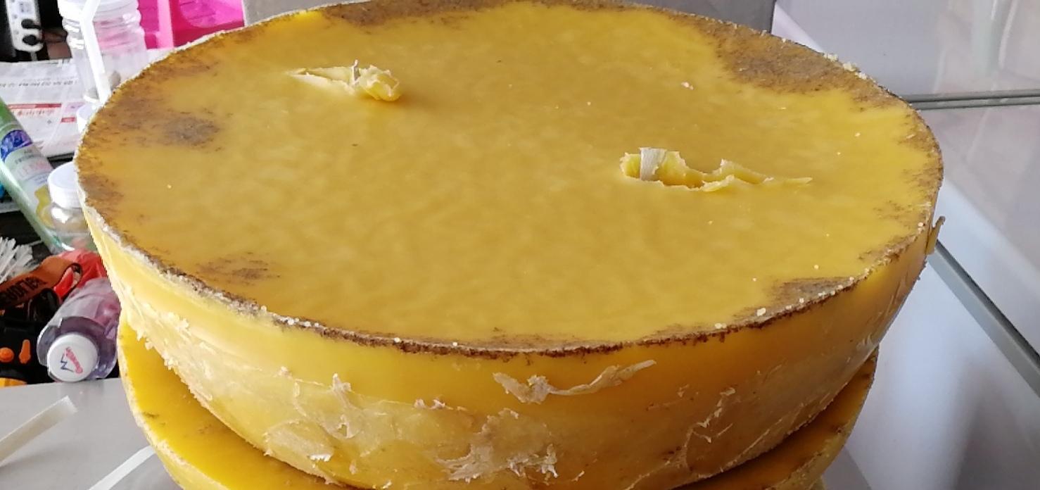 蜂腊是如何得到的,看看蜂农是怎么提练出来的,蜂腊是蜂巢割下它溶化成水的形状后,再用过滤网隔掉那些渣后,凉后就形成固体变成的。