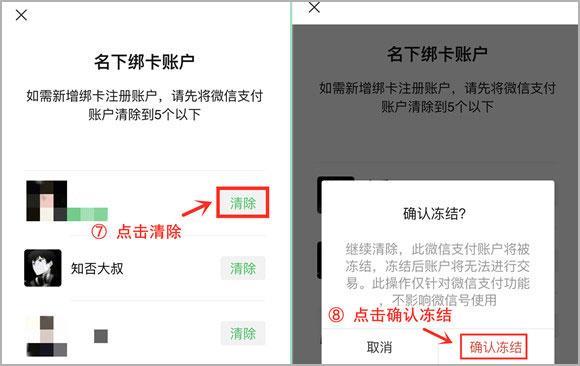 然后就可以看到用你身份信息绑定的微信账号,查看哪个账号不是你自己本人的,点击后面的清除按钮,在弹框中点击确认冻结即可。