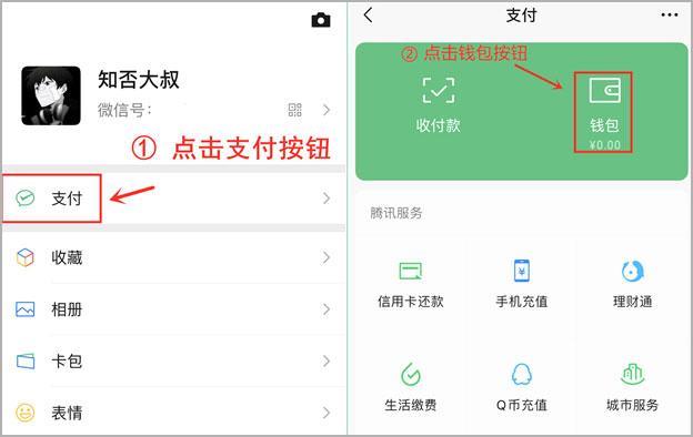 首先我们打开微信“我”界面,点击”支付“按钮,然后再点击“钱包”;