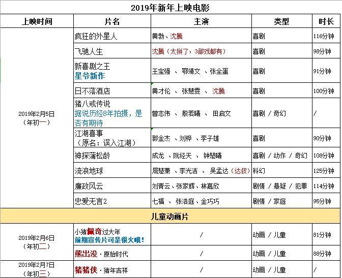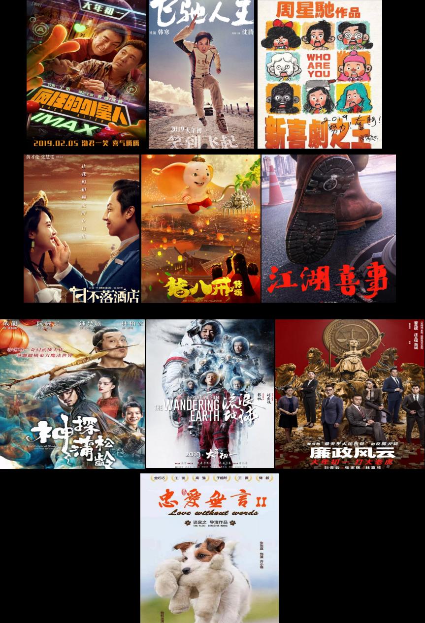 10部贺岁篇(其中一部“星爷新作”呀)+3部儿童动画电影(其中一部是很火的“小猪佩奇”)