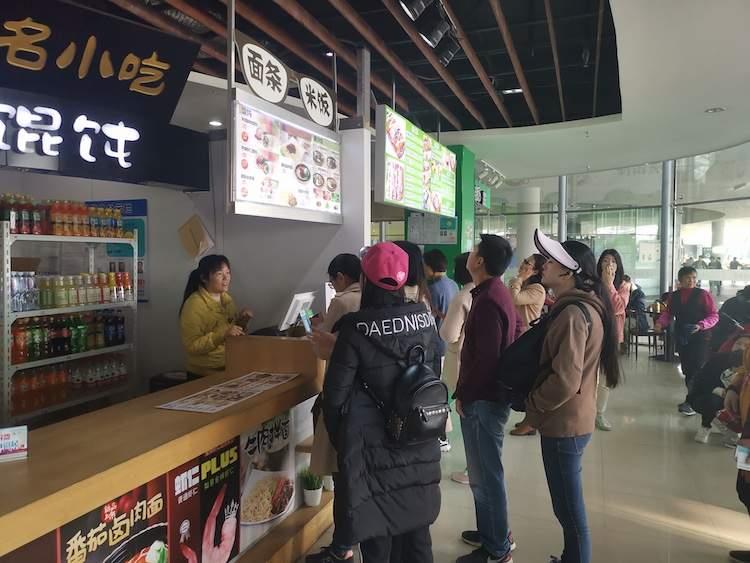 到了午饭时间,辰山植物园二号门附近的绿色餐厅开始热闹起来,不少游客选择来这里就餐。餐厅里面有馄饨、面条、米饭等各种选项。