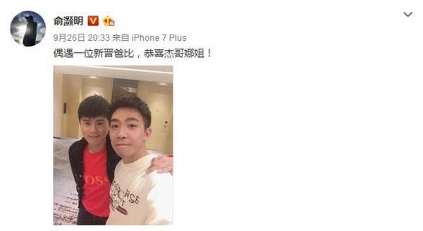 26日晚,俞灏明偶遇张杰,并在微博晒出与张杰的合影,送上祝福。