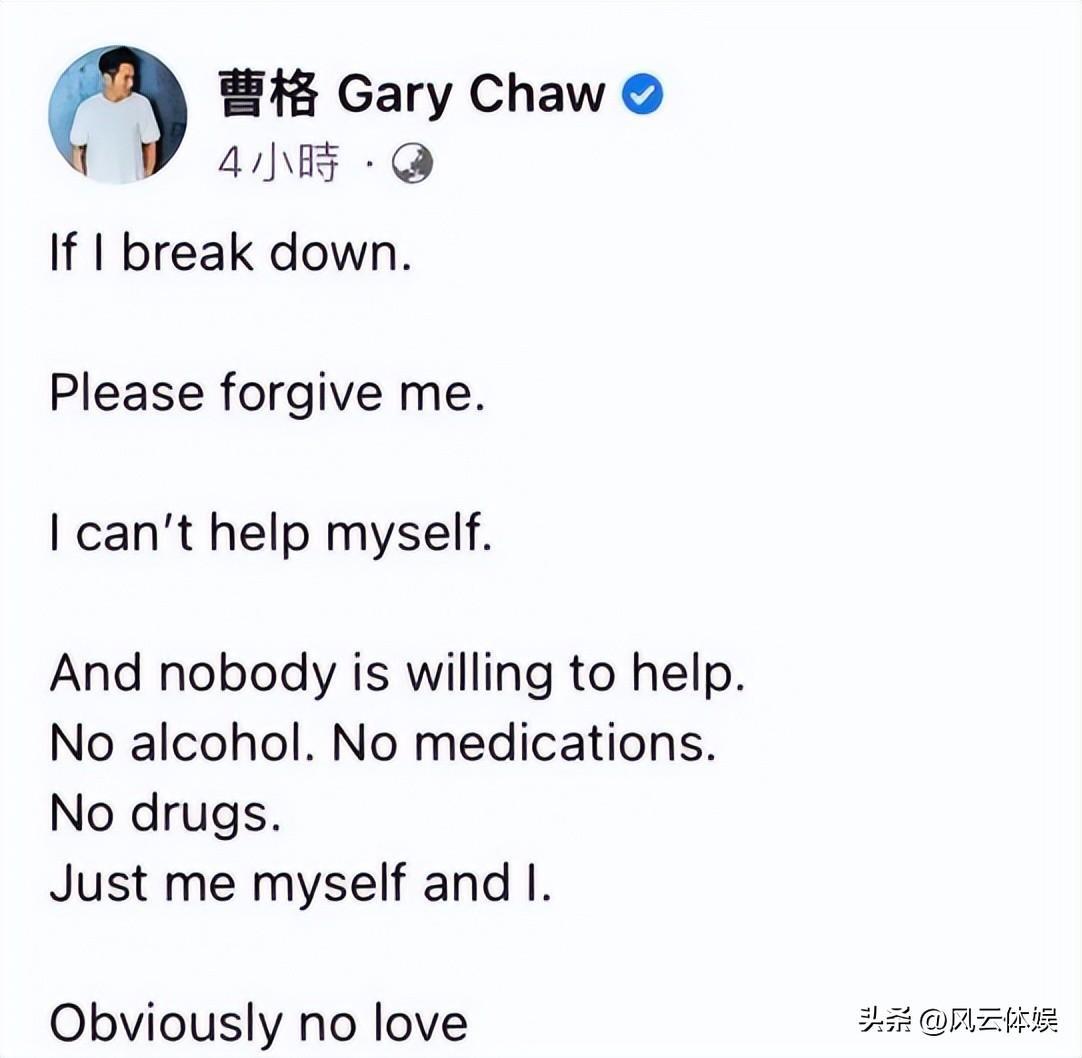 吃瓜群众还在惊讶时,他又莫名其妙地来了一句,我就是爱我老婆,随便你们攻击?更是用了一段英文晦涩地说出了自己真实的想法。那一刻相信曹格是清醒的,他并没有发疯也没有喝酒,只是在用这样的方式在发泄自己那控住不住的情绪。
