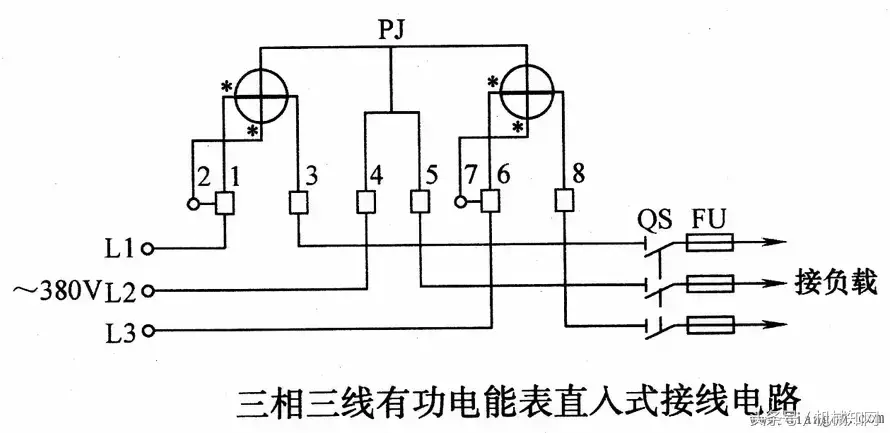 三相电能表接线图3: 【以直接接入式三相三线有功电能表为例】
