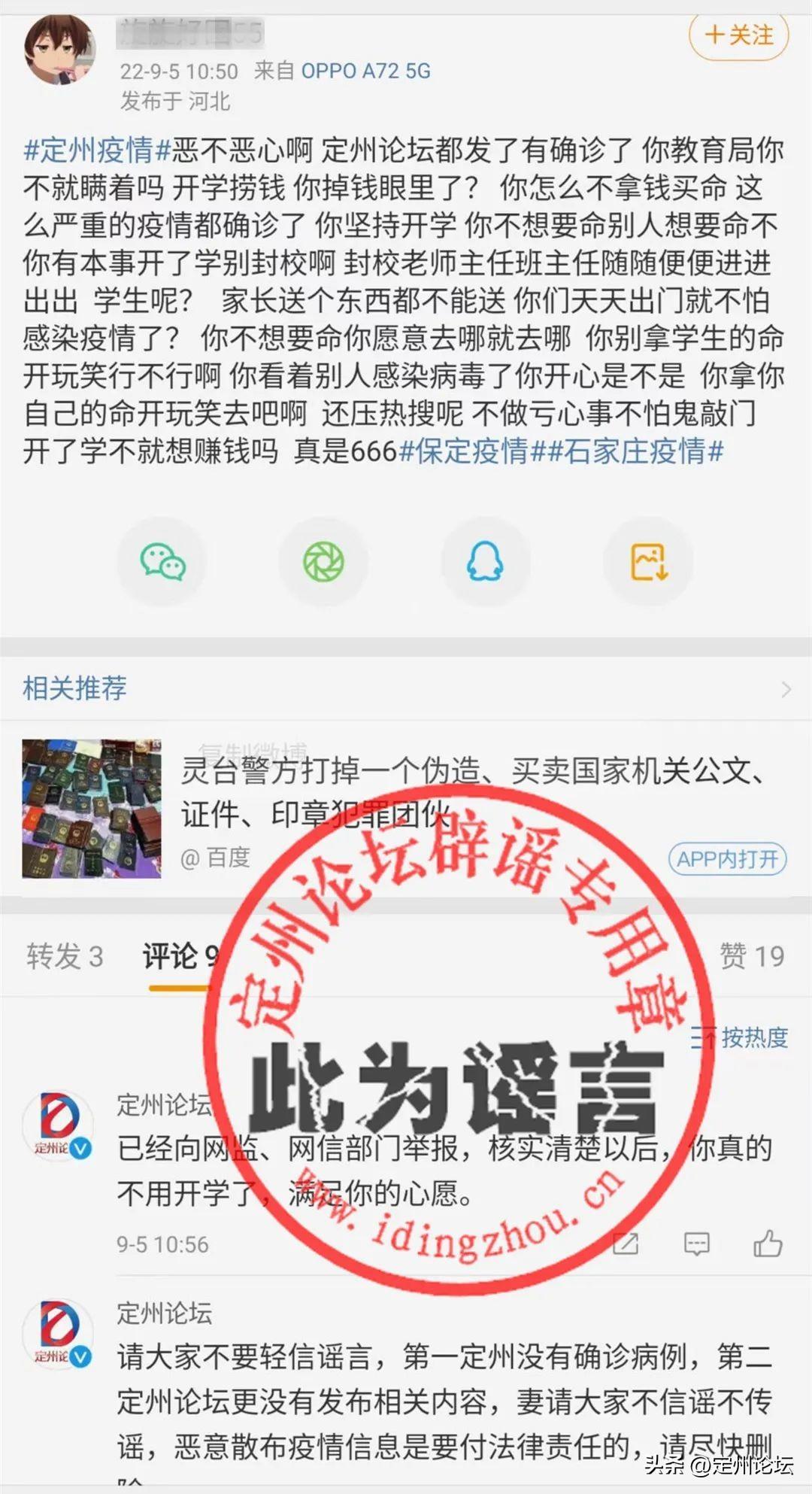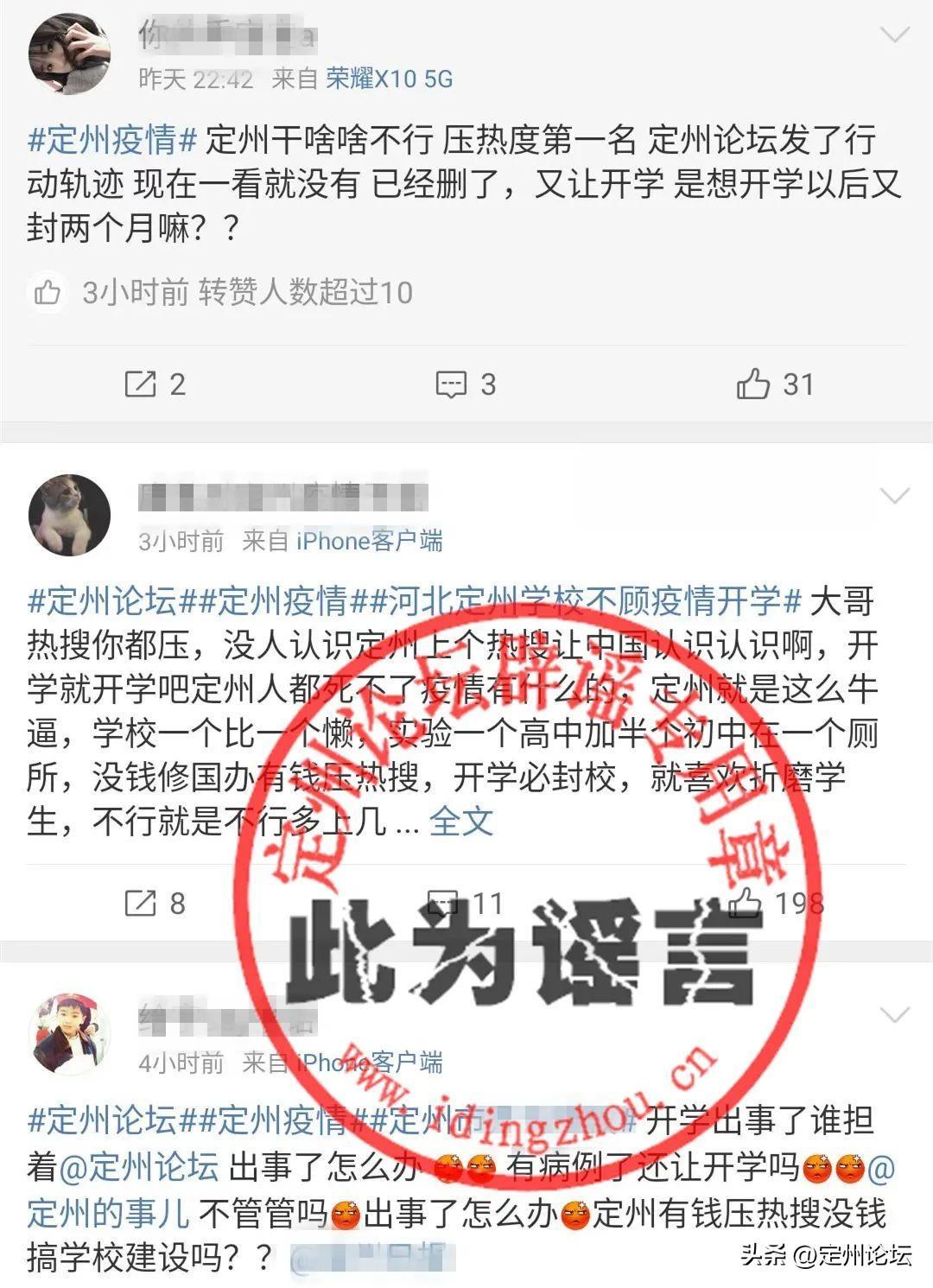 9月5日,在新浪微博上,有部分学生账号发布和传播不实消息,大概意思为定州论坛发布了定州有确诊病例的消息,在如此的前提下,学校还通知学生开学等等等等。