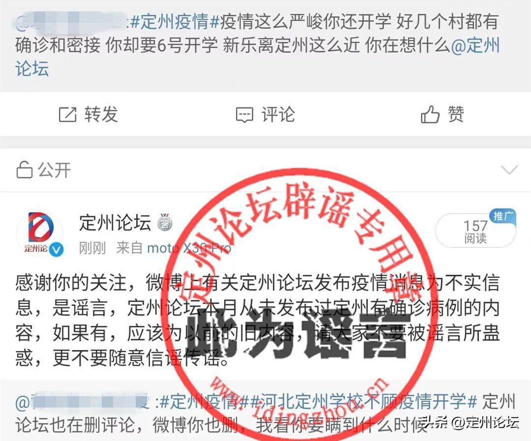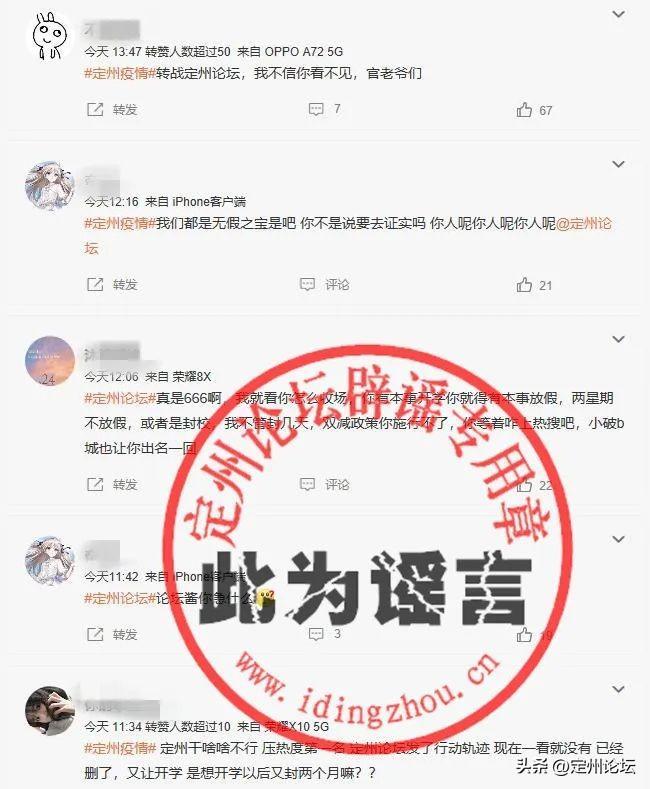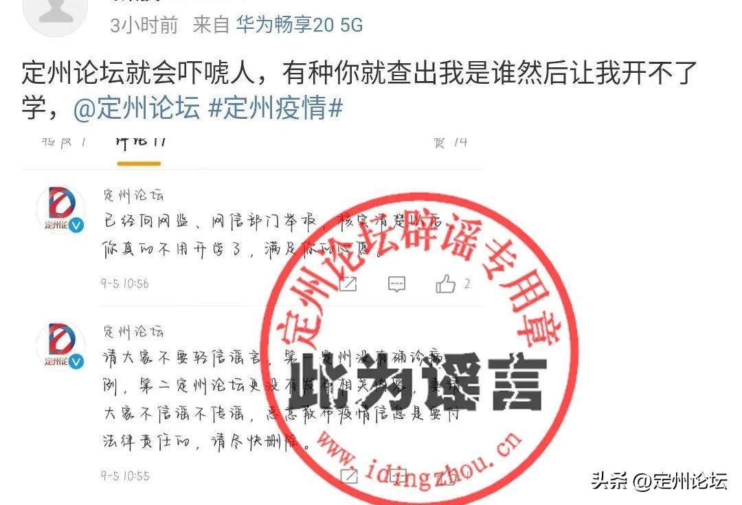该消息发布后,我们第一时间留言进行了警示和劝阻,提示对方不要在网络上随意发布不实信息,虽然开始几条微博先后删除,但是该话题开始在学生中发酵,并且该谣言大有升级之势,在此定州论坛郑重声明如下: