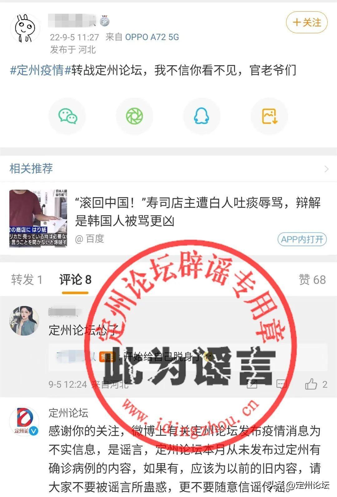 二、我们始终未看到网络上流传的“定州论坛发布确诊信息”的相关截图,判断应该为前段时间的旧闻截图被人修改或者利用,请大家擦亮眼睛,不要为谣言所蒙蔽。