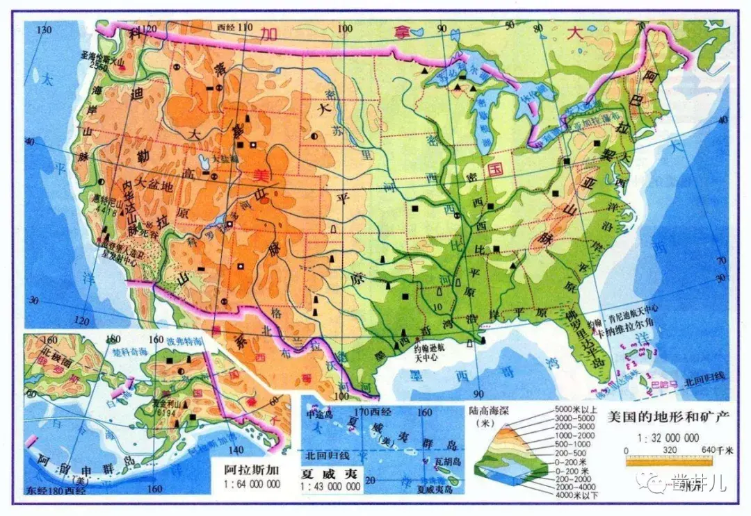 从地理说起,东西两大山脉分别是Appalachian和Cordillera。中部以平原为主,大平原地区是美国主要的农业区。还有一条“河流之父”Mississippi(因支流多)自北流向南注入墨西哥湾。