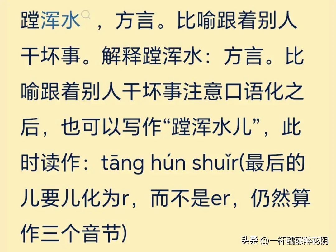 那么到底是“趟浑水”还是“蹚浑水”?就我个人理解应该是“蹚浑水”而不是“趟浑水”,但“趟浑水”的“趟”是不是错别字,很多人认为都可以用,甚至说“趟浑水”比“蹚浑水”更正式一些。从读音来看,有的人认为“蹚”读平声,“蹚浑水”更接近方言,是一个贬义词,而“趟浑水”中的“趟”应该是仄音,表面客观的意思多些,比喻的性质没有“蹚浑水”强烈。