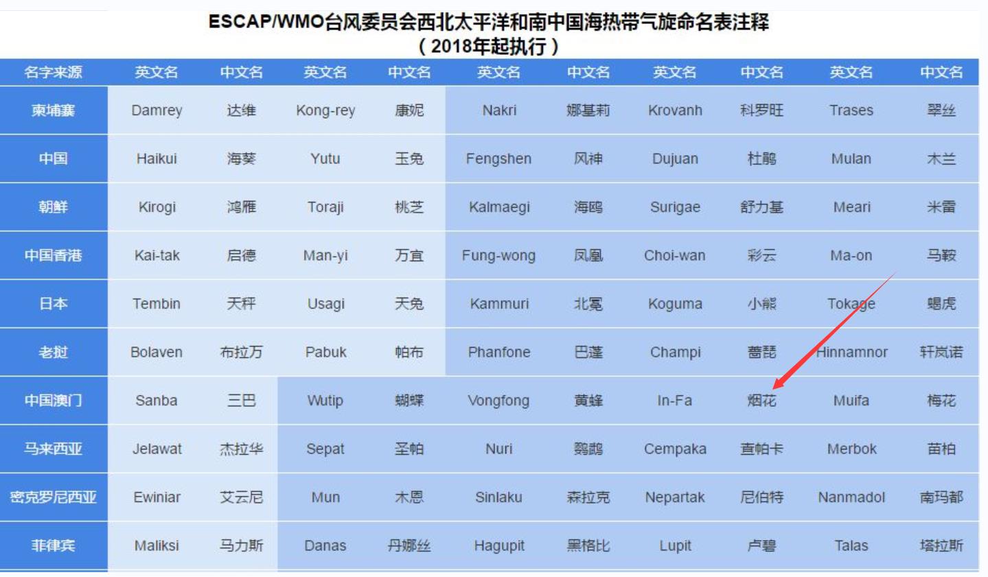 今年第六号台风为什么会取名为“烟花。其实所有的台风名字其实早都已经取好了的,目前台风名字总共有140个,按照顺序依次使用。往年也有以“烟花”命名的台风登陆中国。如果某一个台风给“世界气象组织”的成员国及地区造成了巨大的人员或者财产灾害,则该成员国及地区可以申请将该台风的名称从这140个名称的循环表中除名并将其赋予该台风永久独有。同时,需要提供一个新的名称重新补充入循环表中。