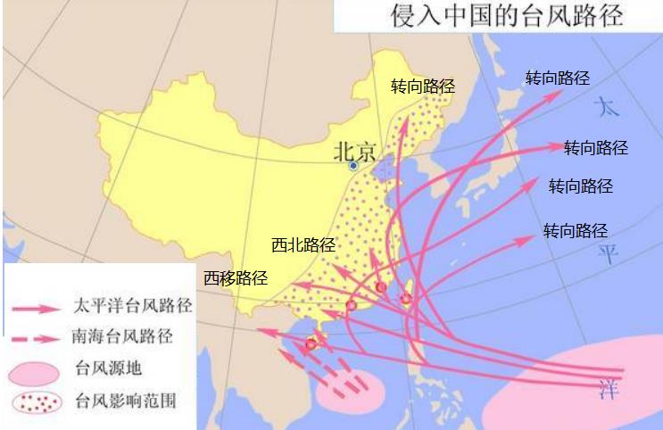 台风从菲律宾以东洋面生成后向西北方向移动,在海上遇到西太平洋副高或西风槽的阻挡,就会转向东北,向朝鲜半岛或日本方向移去。这种转向台风又可以分为三类:东转向、中转向、西转向。