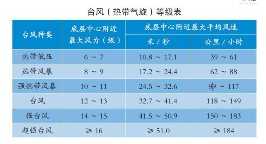 台风是热带气旋的一个类别。根据中国气象局“关于实施热带气旋等级国家标准”GBT 19201-2006 的通知,热带气旋按中心附近地面最大风速(从大到小)划分为超强台风、强台风、台风、强热带风暴、热带风暴、热带低压六个等级。