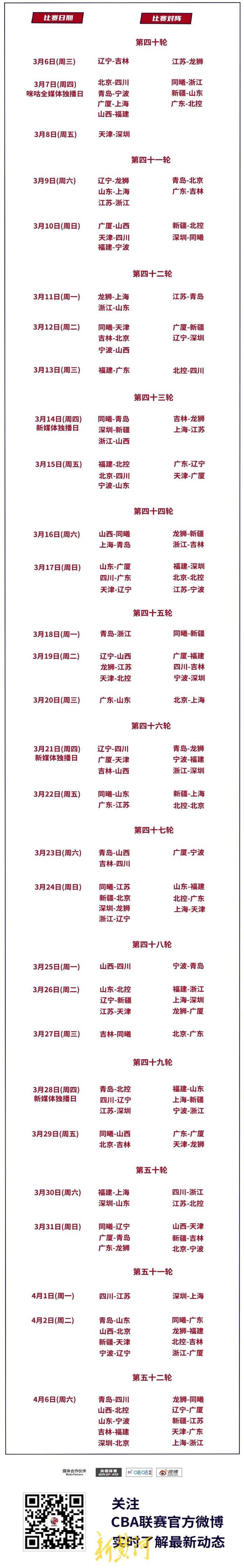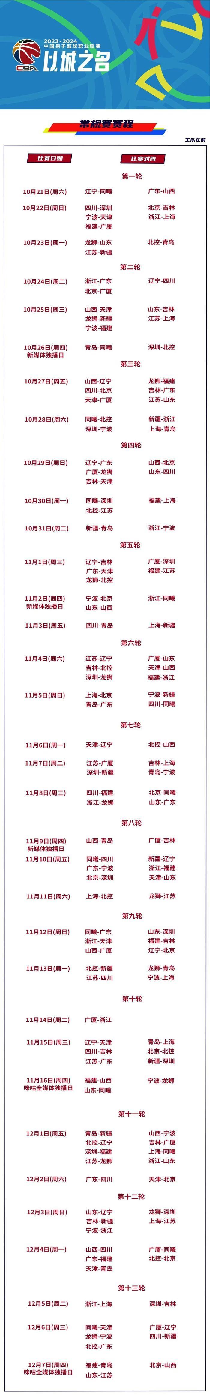 2023-2024赛季CBA联赛常规赛赛程正式公布!新赛季常规赛共52轮,揭幕战将于10月21日在辽宁本钢和南京同曦之间举行,收官战10场比赛将在2024年4月6日同时打响。以城之名,不负使命;与城同心,为城市荣耀而战!