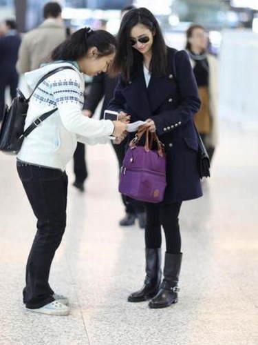 图为佟丽娅给虹桥一姐签名