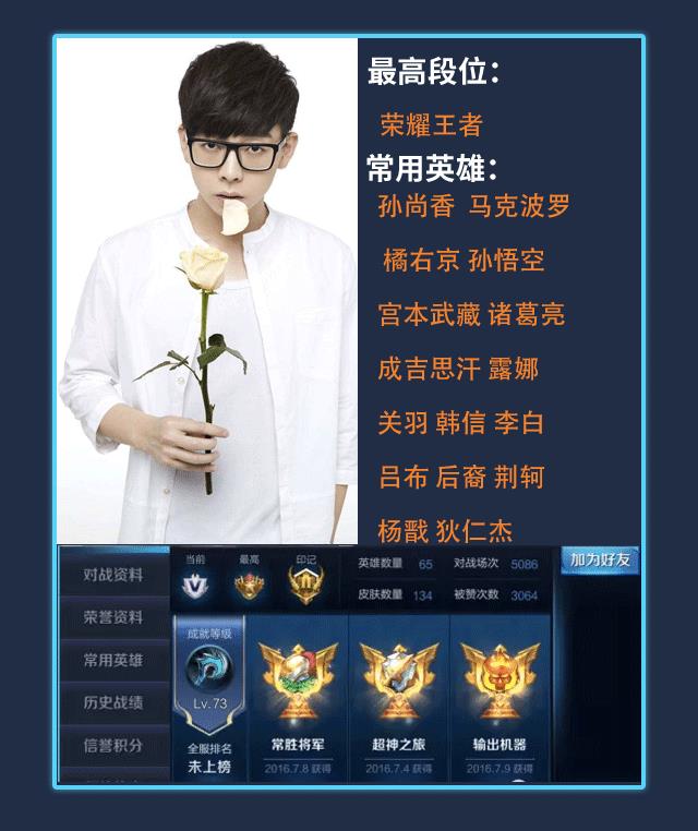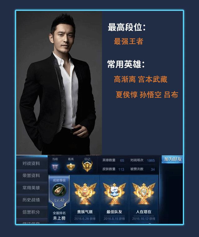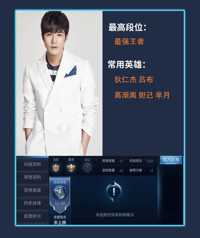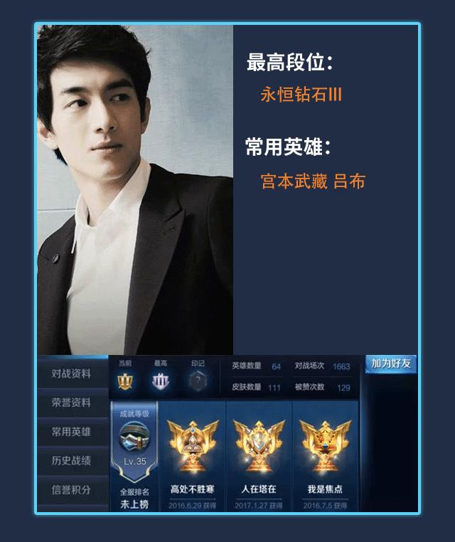 荣耀王者段位,胡夏也是个游戏迷,经常在微博中会晒自己开黑的场景,据说他不仅和其他明星组团开黑,还拜师《王者荣耀》职业战队XQ选手AT学习操作技术和思路,游戏记录显示胡夏已经玩了5000多场了。