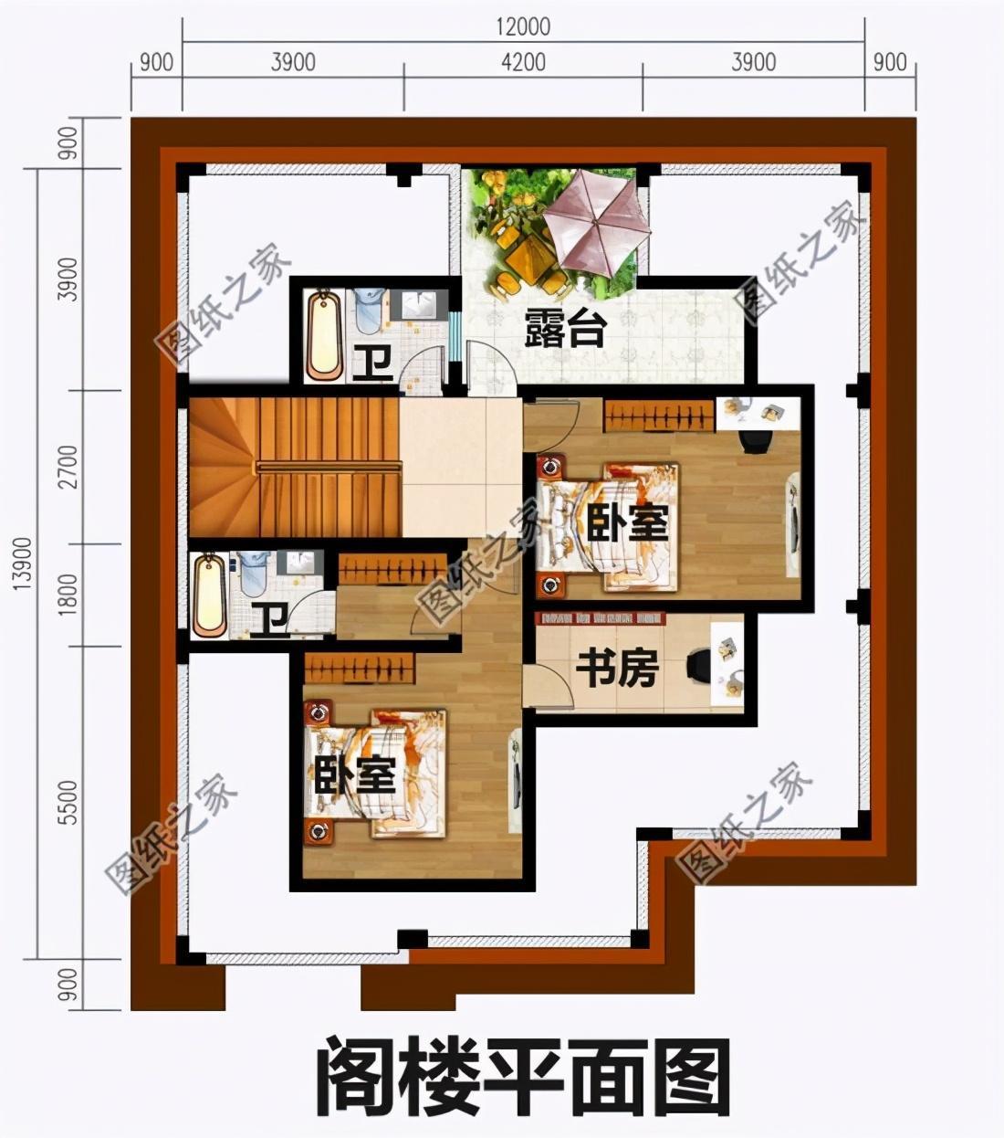 阁楼户型:主卧(带卫生间,衣帽间,书房),卧室,卫生间、露台;