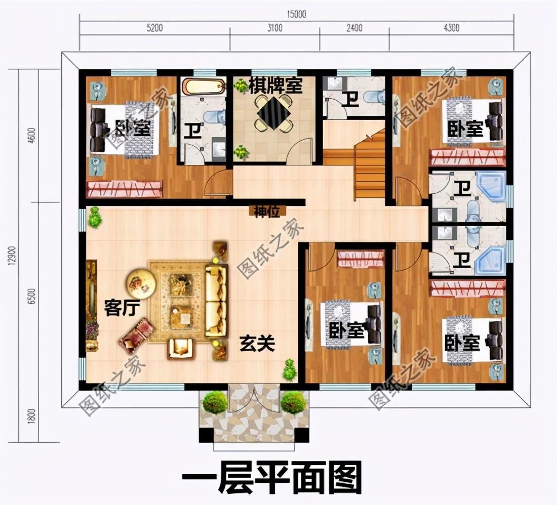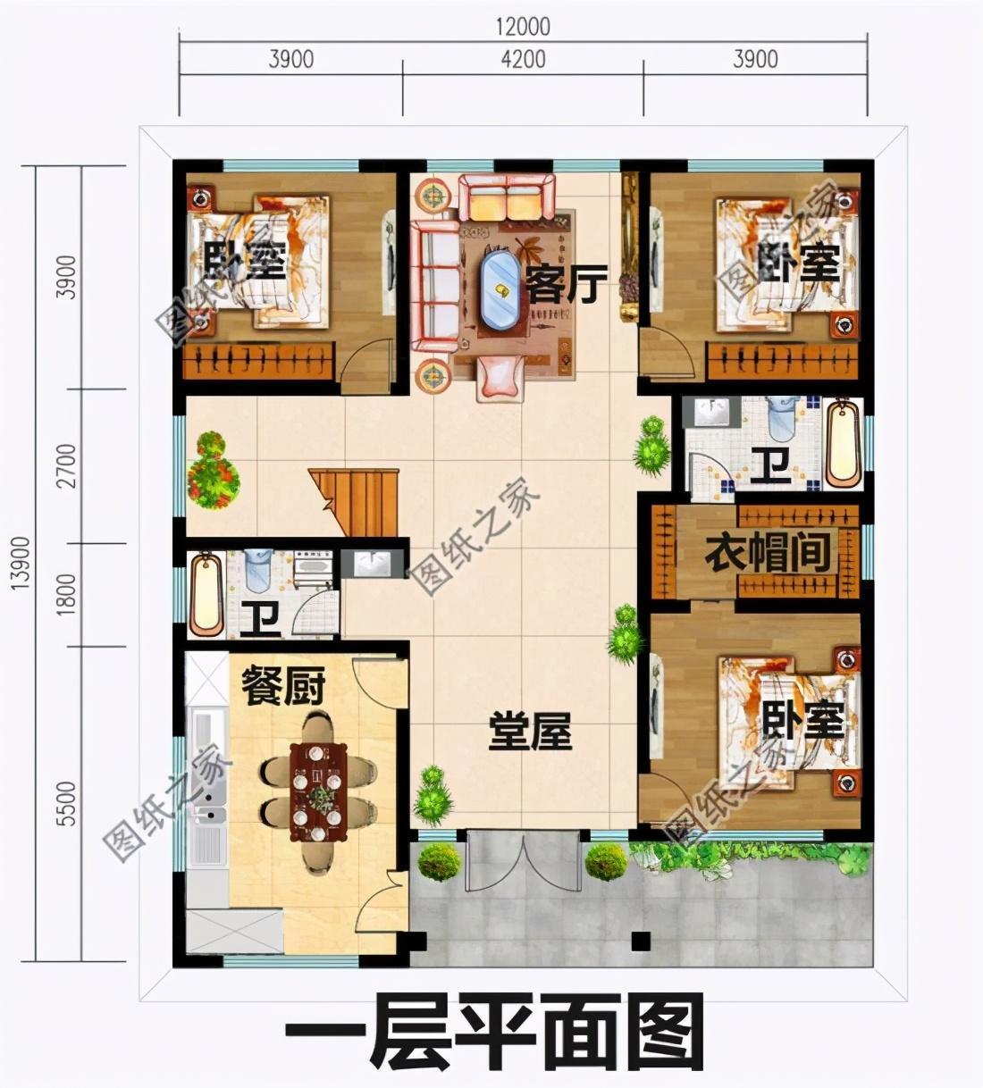 一层户型:堂屋、客厅、餐厅、厨房、卫生间、主卧(带卫生间,衣帽间)、卧室×2;