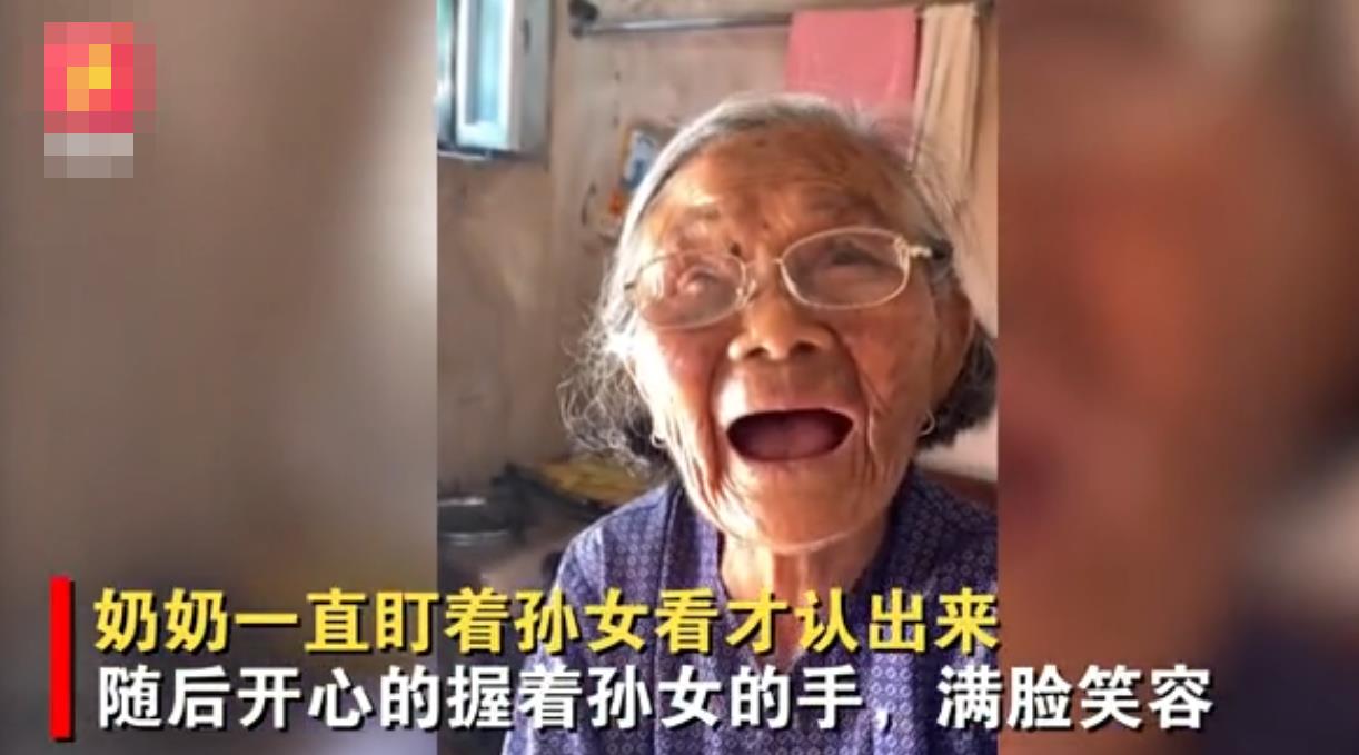 随后该女子大声叫着奶奶,老人这才细看进来的人是谁,当发现是自己许久不见的孙女时,立刻起身上前拉住孙女,并露出了最真挚的笑容。