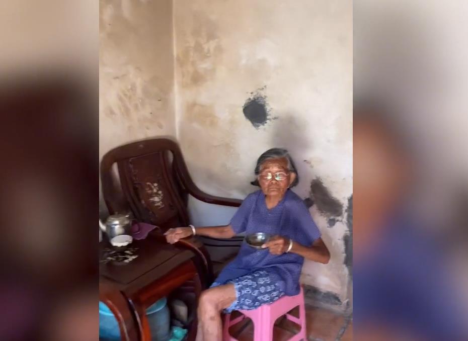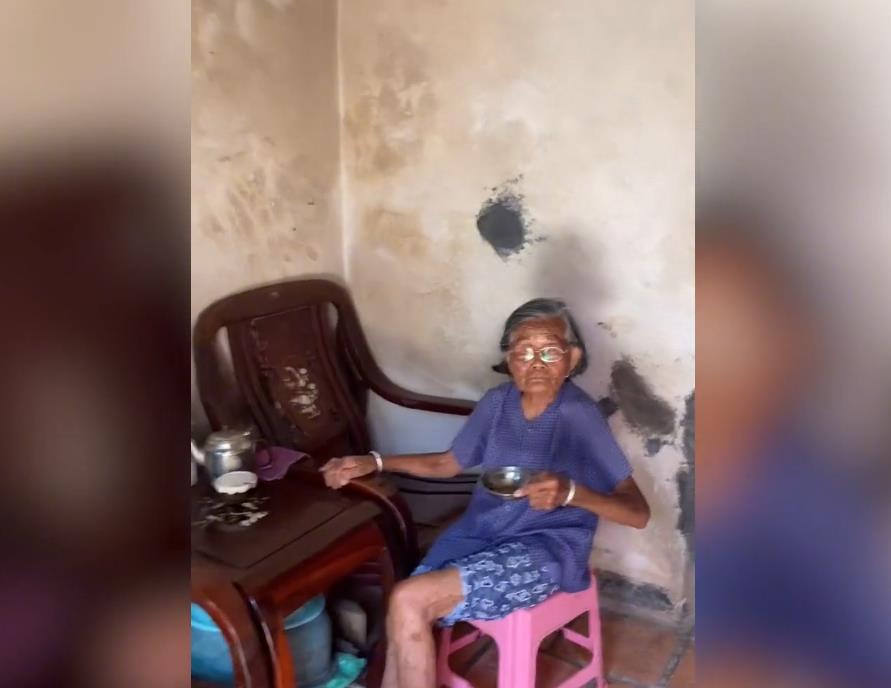 网传视频显示,6月19日广东,一位穿着蓝色上衣、花裤子的老人正坐在粉色的塑料凳子上喝茶,抬头看见有人进来,以为是客人便叫其喝茶。