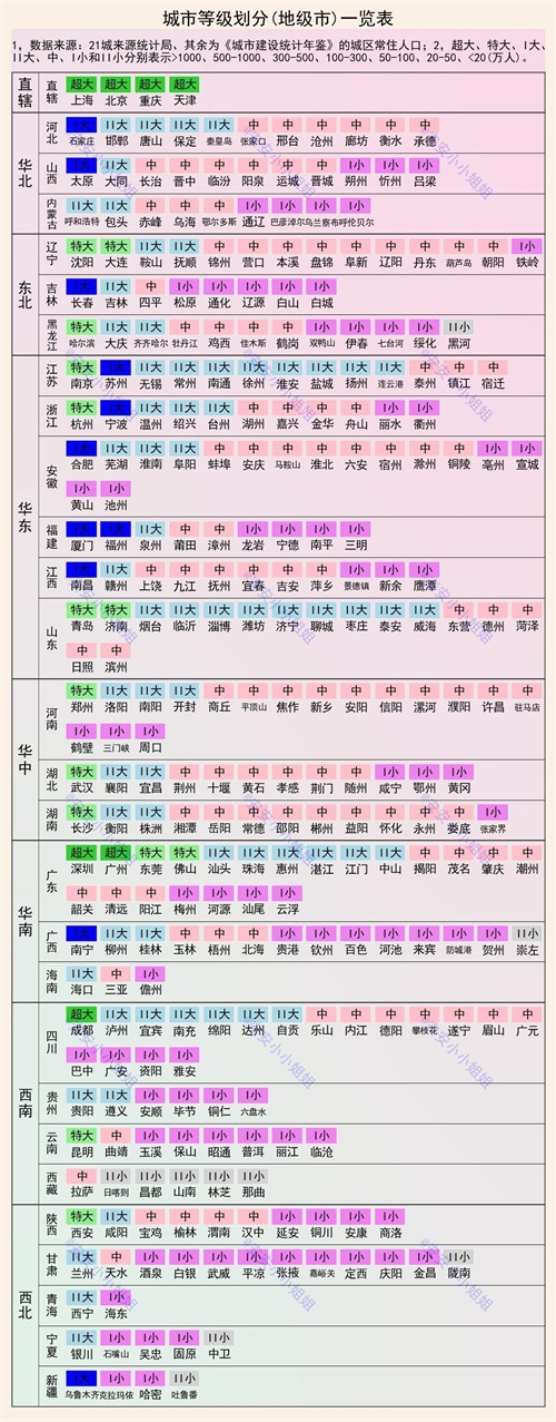 关于城市的等级划分,还有一份来自官方的标准,以城区常住人口为统计口径,将全国的地级及以上和县级城市划分为五类七档,分别是超大城市、特大城市、I型大城市、II型大城市、中等城市、I型小城市和II型小城市,对应城区常住人口数量分别为:>1000万、500-1000万、300-500万、100-300万、50-100万、20-50万和<20万。