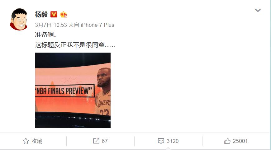 昨日这场比赛赛前,演播室的背景图中打出了总决赛预演标题,对此,杨毅就在微博中直言道:“这标题反正我不是很同意”。此话一出,引发了球迷关注与热议。有球迷直言道:“为什么要你同意啊”“杨老师情商堪忧”