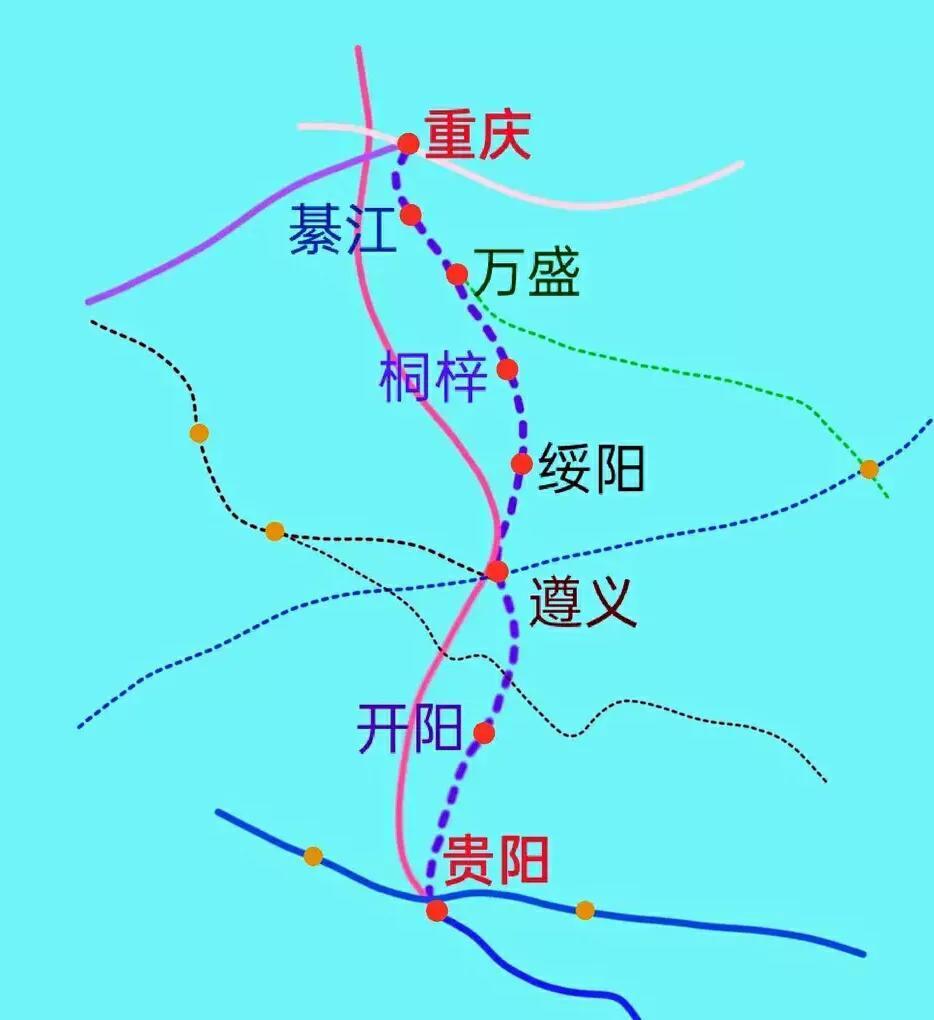 蓝色虚线为新建渝贵高铁,红线为现渝贵快铁