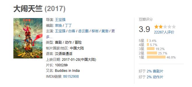 1月28日,是中国电影最辉煌的一天,星爷,王宝强,成龙大哥,联手给了豆瓣铁拳。王宝强处女作《大闹天竺》首日票房超过《功夫瑜伽》。可是豆瓣评分只有3.9分那么低。