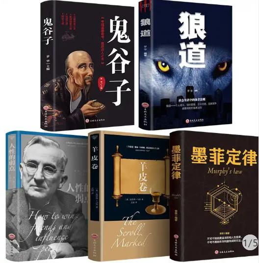 全套书非别是:《鬼谷子》《羊皮卷》《墨菲定律》《人性的弱点》《狼道》。