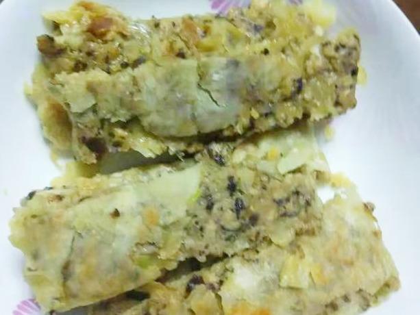 用醒发过的面除了做油酥馅饼以外,还可以用来做韭菜素三鲜馅饼,经过刷油醒发的面延展性强,可以把面皮擀的很薄的长方形大面片,然后在面片上铺放入馅料卷成长条,最后边拽边盘成圆形的生胚,这样烙出的馅饼可以达到皮薄如纸的效果。