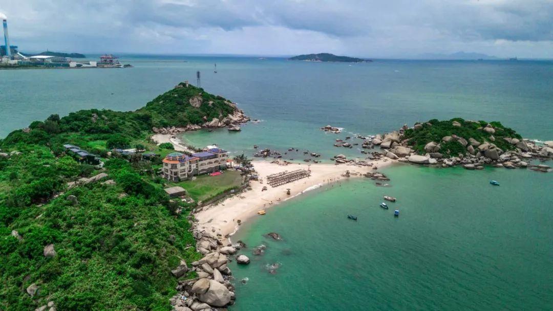 海岛上分布着三个晶莹洁白的沙滩,其中一个内海湾呈现新月形,岛上的岩石形态各异形成了天然的石雕公园,两个岛屿涨潮时,海水波澜涟漪,退潮时沙滩洁白柔软,整个海岛郁郁葱葱,亭台楼阁若隐若现与岛上的奇石遥相呼应,海岛上的奇石有的像海狗、有的像海豹、有的像嘴唇、有的像大脚板,让整个岛屿如同梦幻的桃花源一般生动有趣。