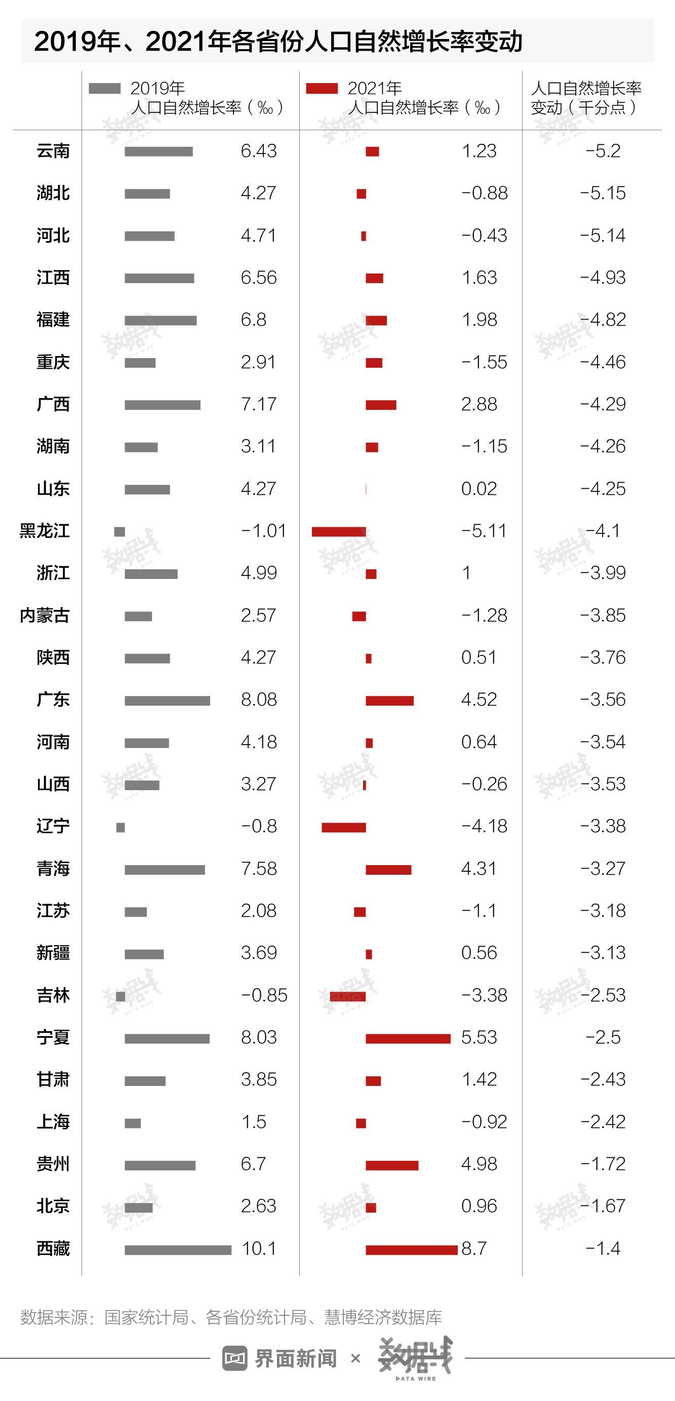 分各省份来看,据界面数据测算,在有人口自然增长率可查的27个省份中,以2019年数据为基准线(2020年仅3个省份公布了人口自然率数据),2021年,人口自然增长率下降最大的3个省份是云南、湖北、河北,跌幅超5个千分点。