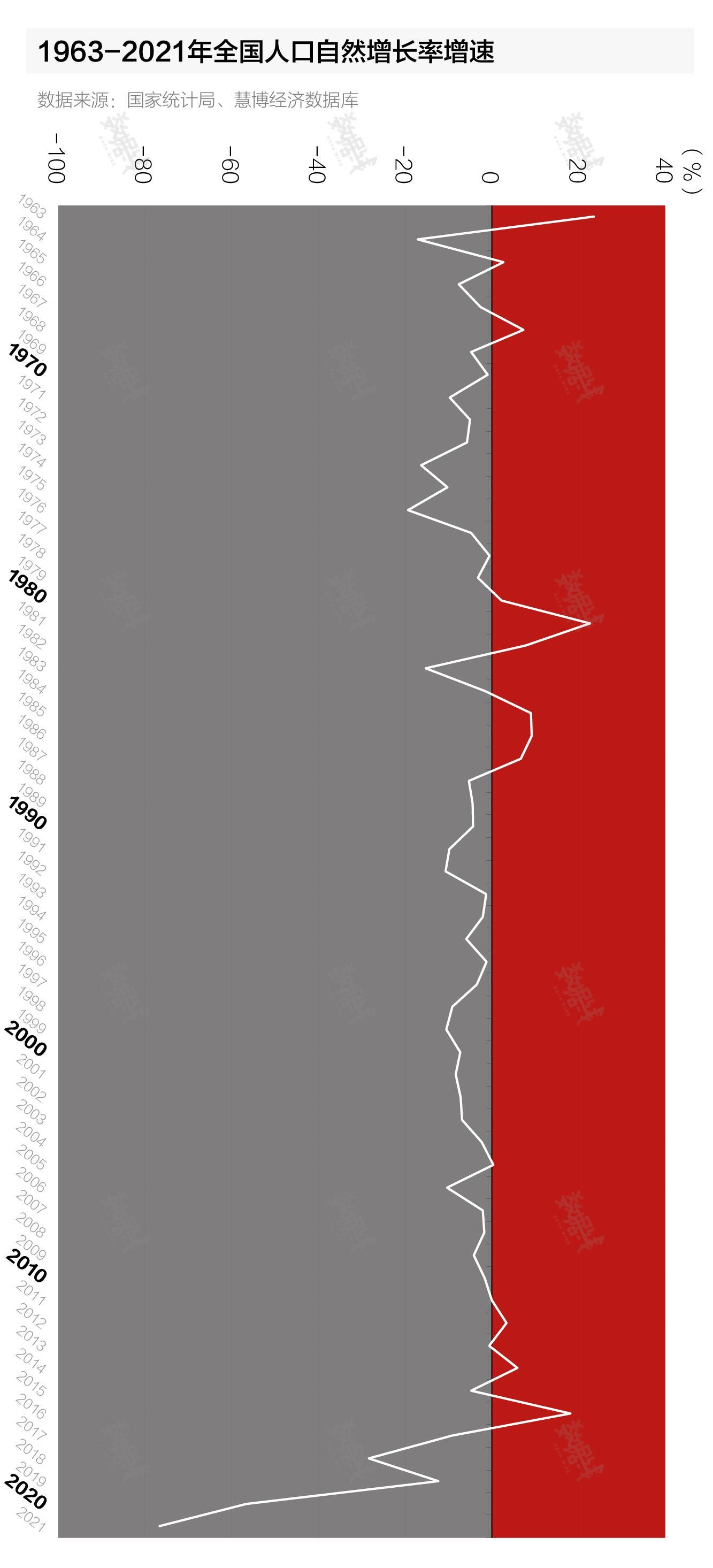 从单年同比降幅来看,据界面数据测算,1964年至今的57年里,有45个年份,全国人口自然增长率同比增速为负值。有12个年份,全国人口自然增长率同比增速为正值。仅有1个年份,全国人口自然增长率持平、较此前一年未有变动。