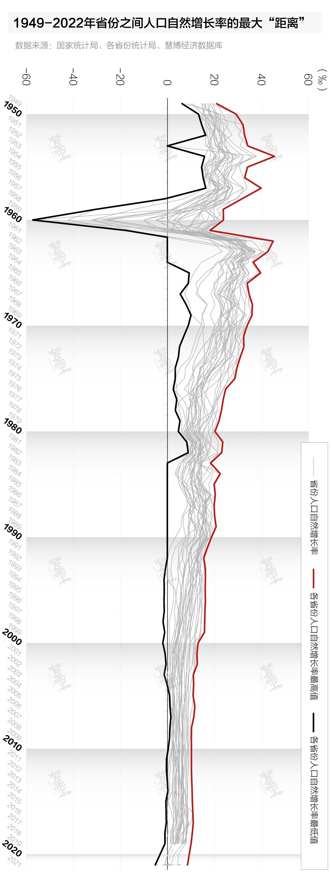 界面数据进一步统计后发现,1960年以来,各省份之间人口自然增长率的跌势在趋缓、“差距”在缩小。