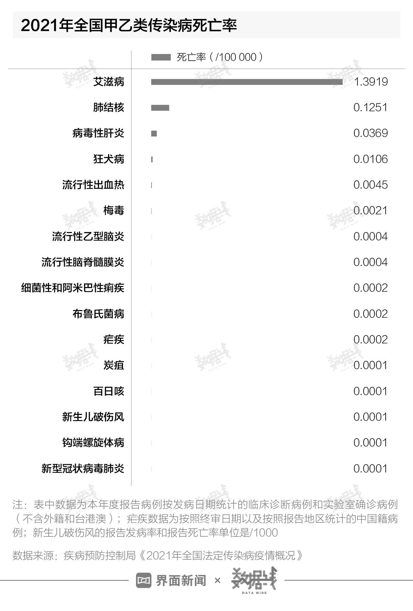 与其他传染病相比,0.0001/10万的死亡率处在何种水平?2021年,全国法定传染病的死亡率为1.81/10万。在16种有死亡率公布的甲乙类传染病中,死亡率为0.0001/10万的新冠肺炎,与炭疽、百日咳等4类传染病并列倒数第一。排在首位的的艾滋病,死亡率为1.3919/10万。