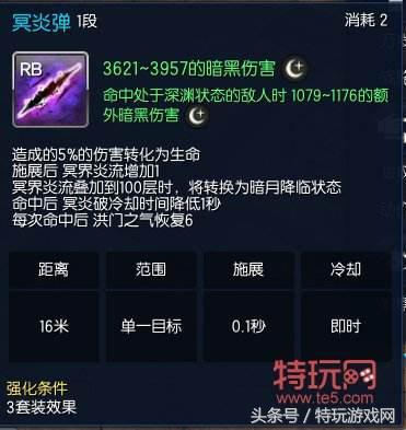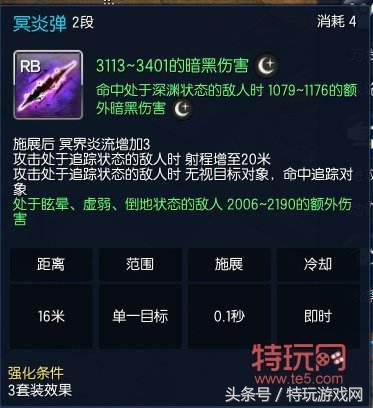 冥炎弹(RB)命中后可使用,CD 3秒【CD期间可用 弱点射击(3) 3次命中后 使用 爆裂弹夹(F) 挂上 6秒深渊buff来增加 冥炎弹(RB) 的额外伤害】 增加25 层 冥界炎流 buff