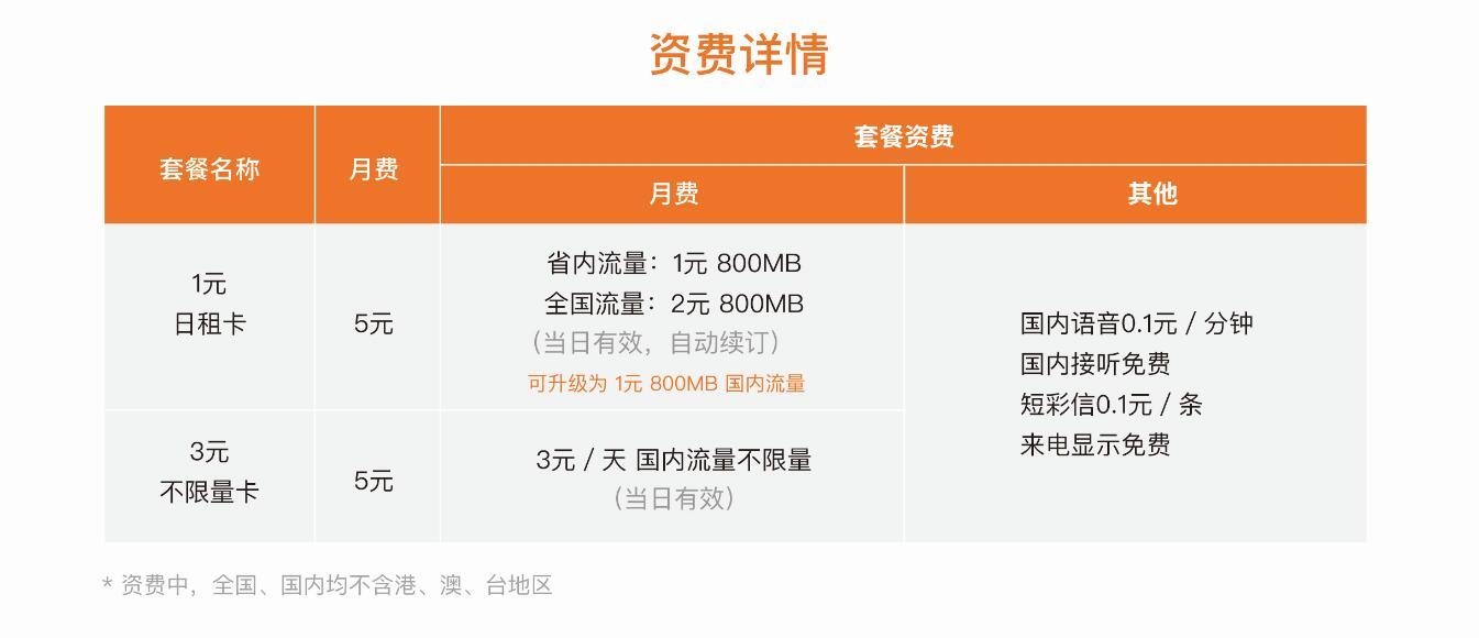 每天花费 1 元,享受 800 M 省内流量;或是每天花费 2 元,享受 800 M 国内流量。