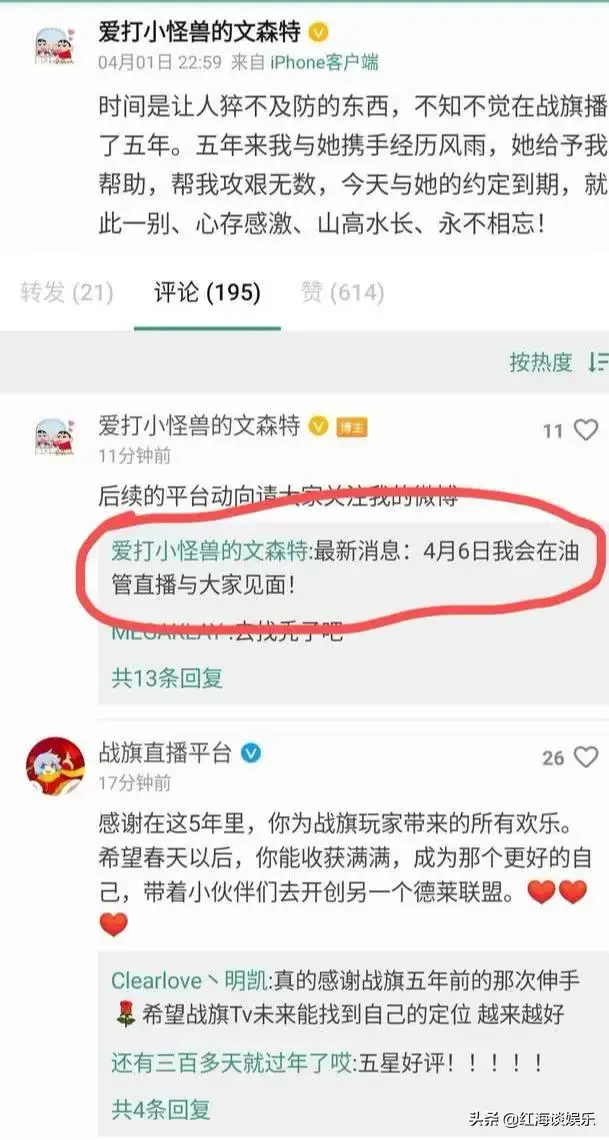 其中最为被玩家看好的无疑是斗鱼和虎牙这两家直播平台了。不过,文森特此前是从斗鱼“离家出走”的,这样一来去斗鱼的概率小了很多。于是虎牙就成为了文森特最好的选择。然而,让玩家感到意外的是,文森特在微博中表示,自己将在4月6日在国外的油管直播。