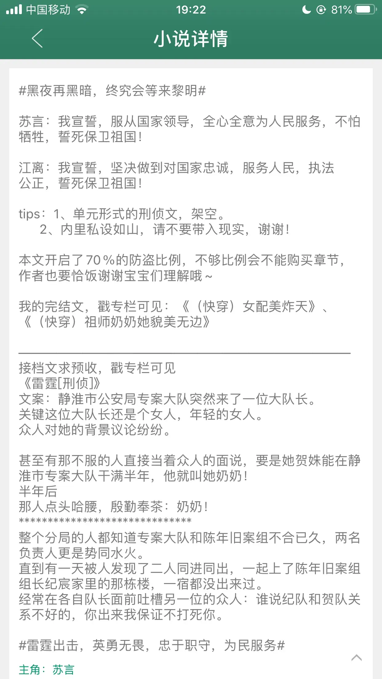 这文跟上文冬至都是一个作者,先看了冬至才看到的这文,这是民国文,男主不算是警察,但跟探案相关,算他半个吧,文也很精彩,所以放在一块推。