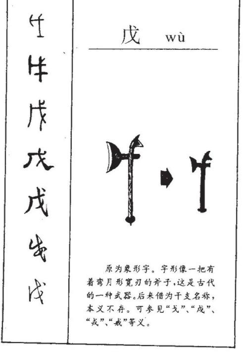 戊字最早见于商朝甲骨文,形声字。甲骨文的“戊”字,斧形大致不变,但字体却已开始线条化了。金文的“戊”,此时“戊”的形体开始变了,顶钩变了,斧柄弯了、脚叉成为斜线。秦篆的“戊”字,讹变更大:斧柄弯而短,脚叉弯而长,顶钩竟成为丫杈形了。于是便相沿发展为汉隶和之后的楷书“戊”。其字源演变图如下: